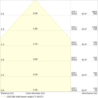 De gradenbundel geeft informatie over hoe breed het licht wordt uitgestraald. Dit zit tussen de 0 en 360 graden (D). Hoe kleiner de hoek, hoe specifieker de lichtbundel is. Over het algemeen is een smalle gradenbundel perfect voor sfeer- of accentverlichting, terwijl een brede gradenbundel ideaal is om grote oppervlaktes te verlichten.