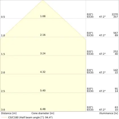 De gradenbundel geeft informatie over hoe breed het licht wordt uitgestraald. Dit zit tussen de 0 en 360 graden (D). Hoe kleiner de hoek, hoe specifieker de lichtbundel is. Over het algemeen is een smalle gradenbundel perfect voor sfeer- of accentverlichting, terwijl een brede gradenbundel ideaal is om grote oppervlaktes te verlichten.